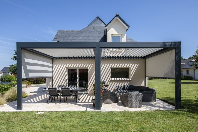 La pergola bioclimatique vous permet de vous protéger du soleil et de la pluie en toute saison. Vous profiterez ainsi de votre terrasse plus tôt et plus tard dans la saison grâce à la protection de son toit avec ses lames orientables mais aussi à ses cotés avec des stores enroulables ou coulissants vitrés.